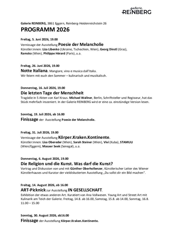 Bitte vormerken: Am 5. Juni 2026 startet unsere erste Ausstellung, am 31. Juli findet die Vernissage der zweiten Schau statt. Und hier die weiteren Termine: